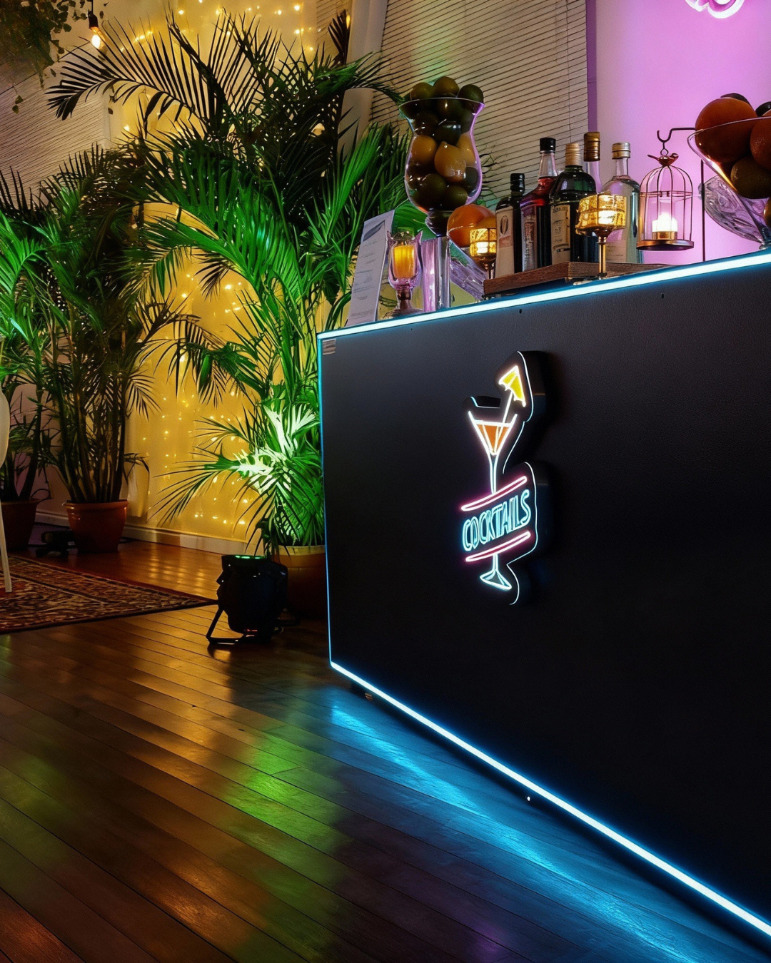 Soluções integradas com ilha de drinks, estrutura de som e luz profissional, DJ e pista LED. Tudo que você precisa em um único lugar para facilitar.