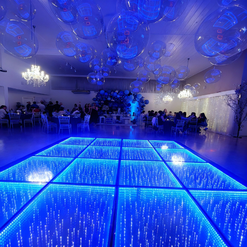 Pista de dança iluminada com tecnologia LED sincronizada que rouba a cena. Efeitos visuais incríveis para fotos memoráveis e momentos inesquecíveis.
